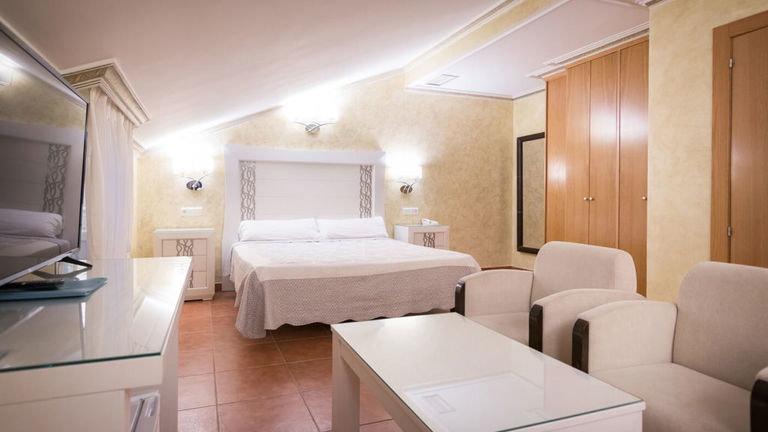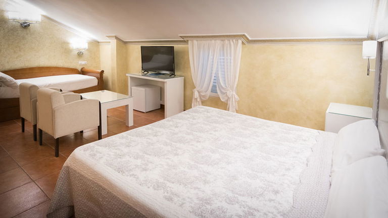 Habitación para tres personas abuhardillada sin acceso directo en ascensor. Dispone de zona de estar ideal para relajarse y un baño con bañera de hidromasaje, perfecta para disfrutar de un momento de descanso y bienestar.
